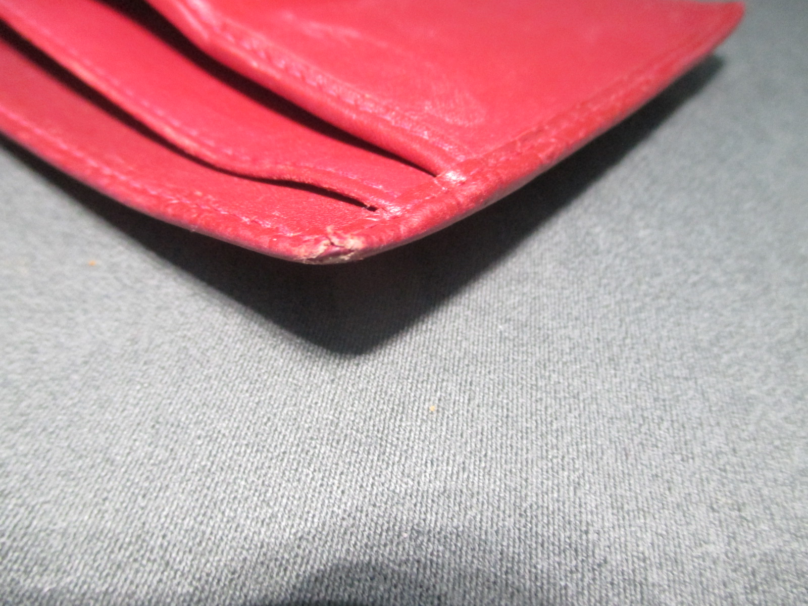 ご依頼の財布も本体に傷みは少ないのですがすれる箇所は傷んで革が欠損し穴が