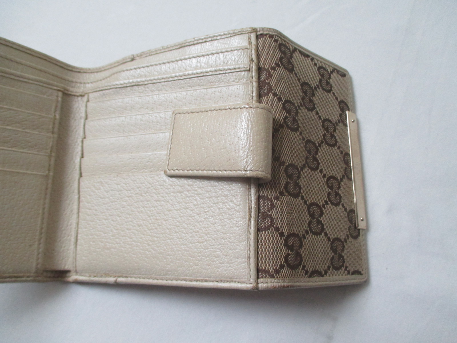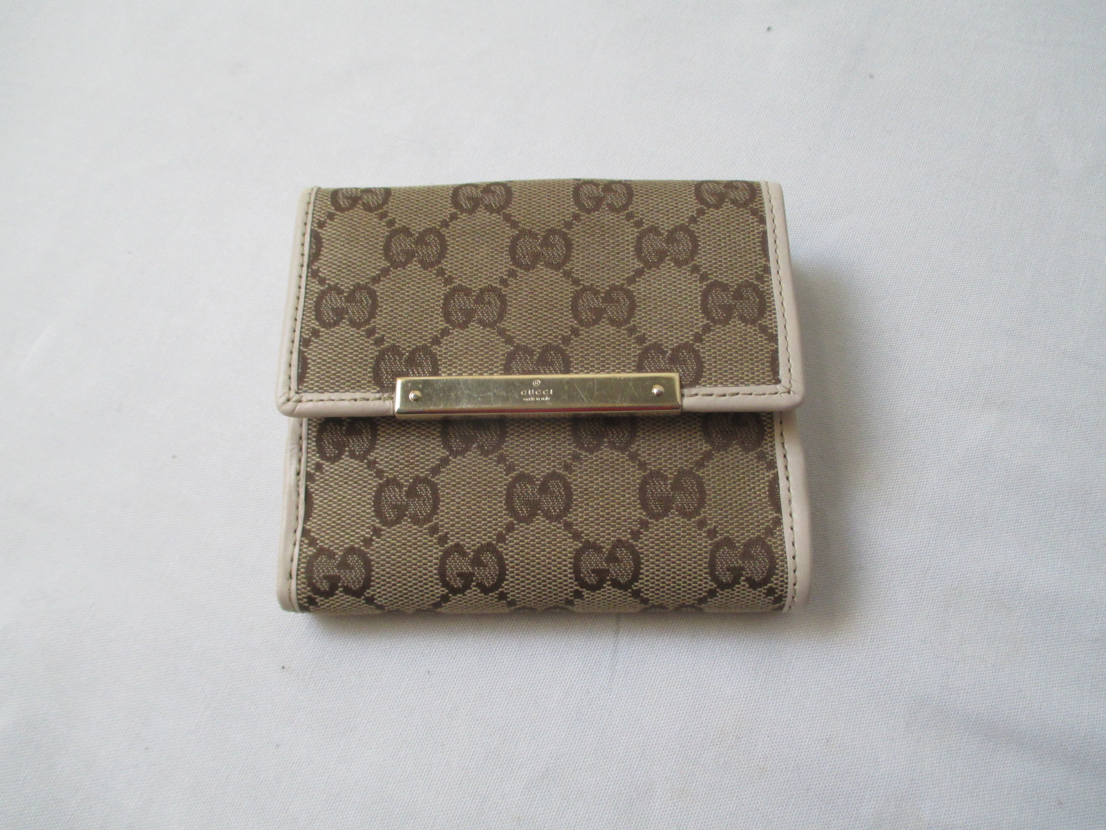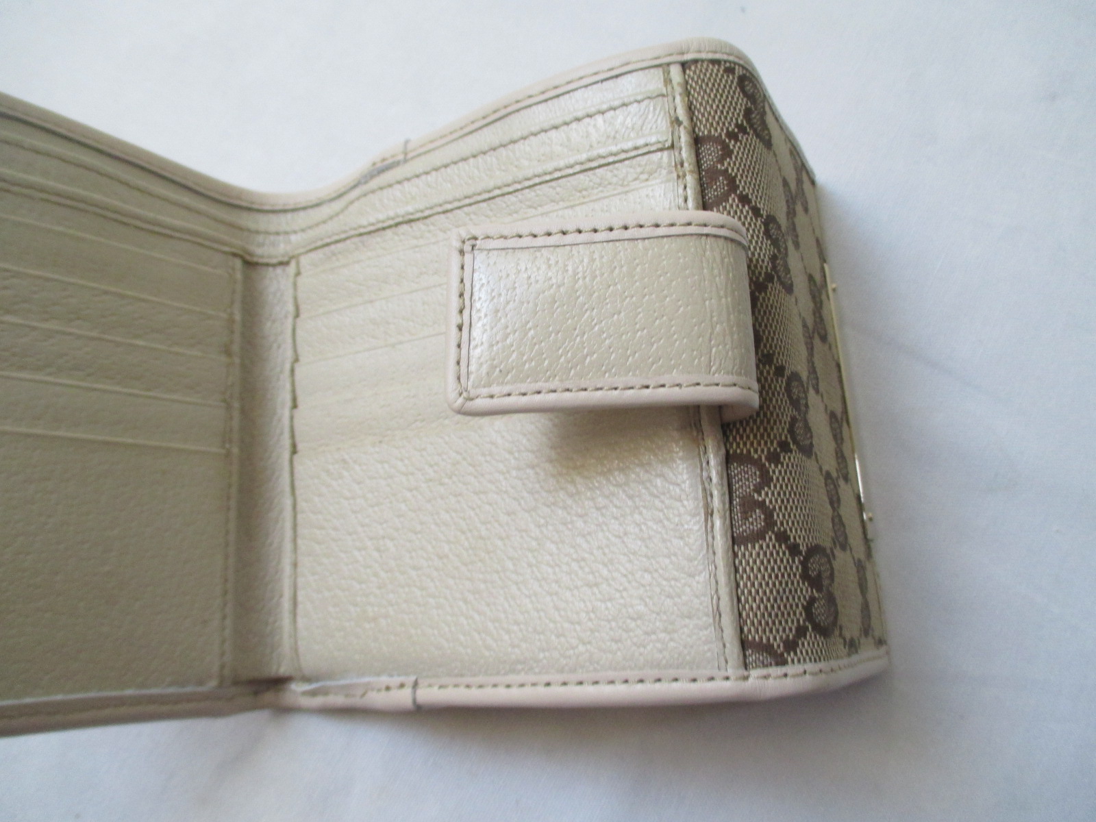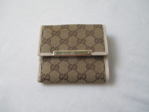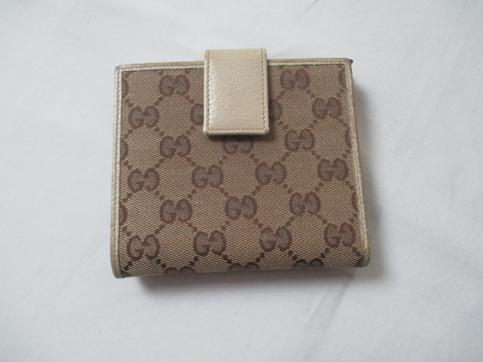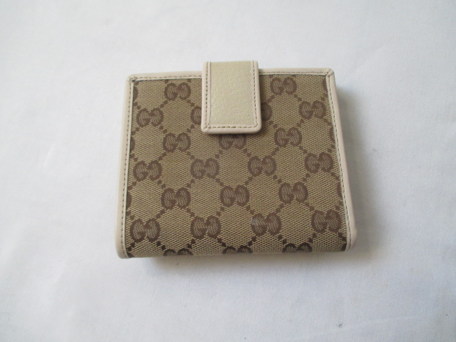 GGマークのキャンバス生地に周りが革巻きされた財布になります。