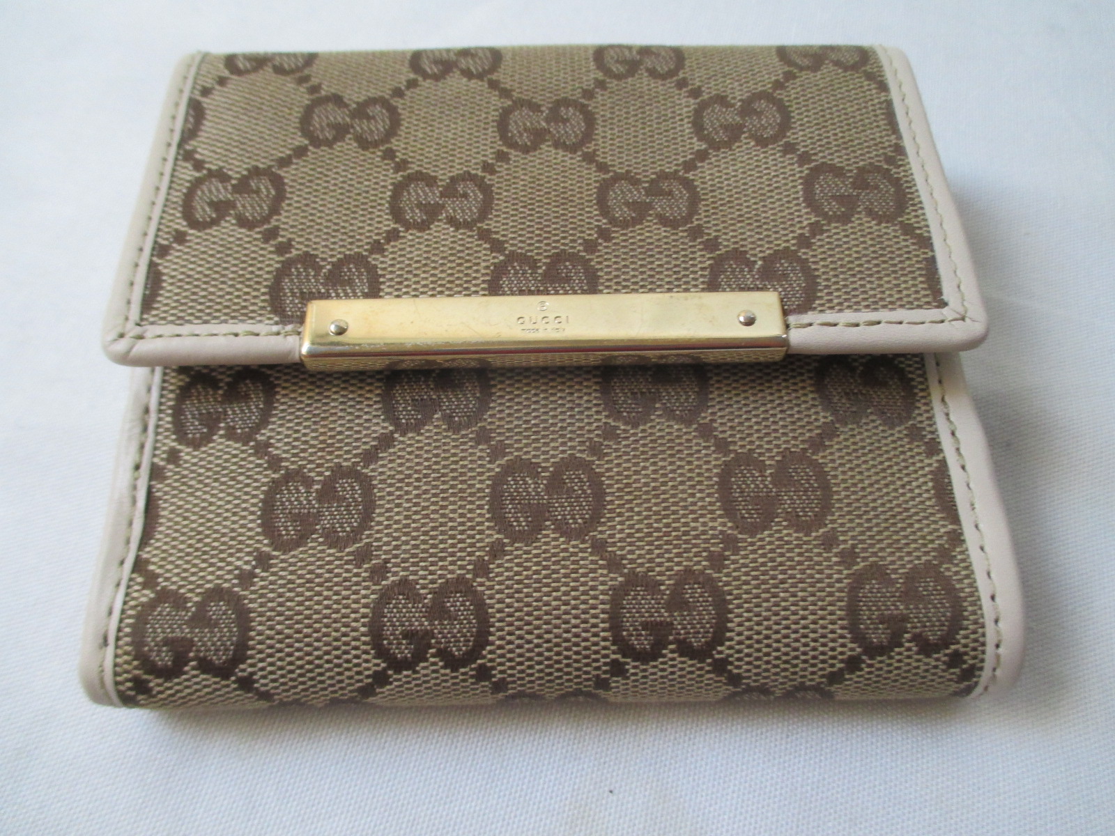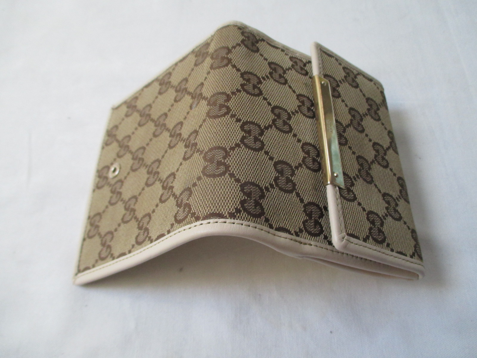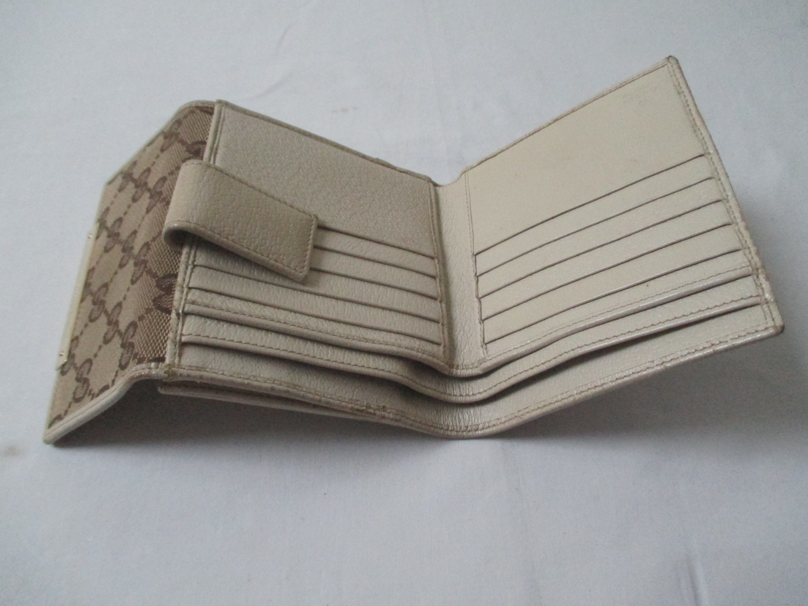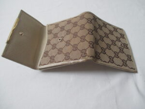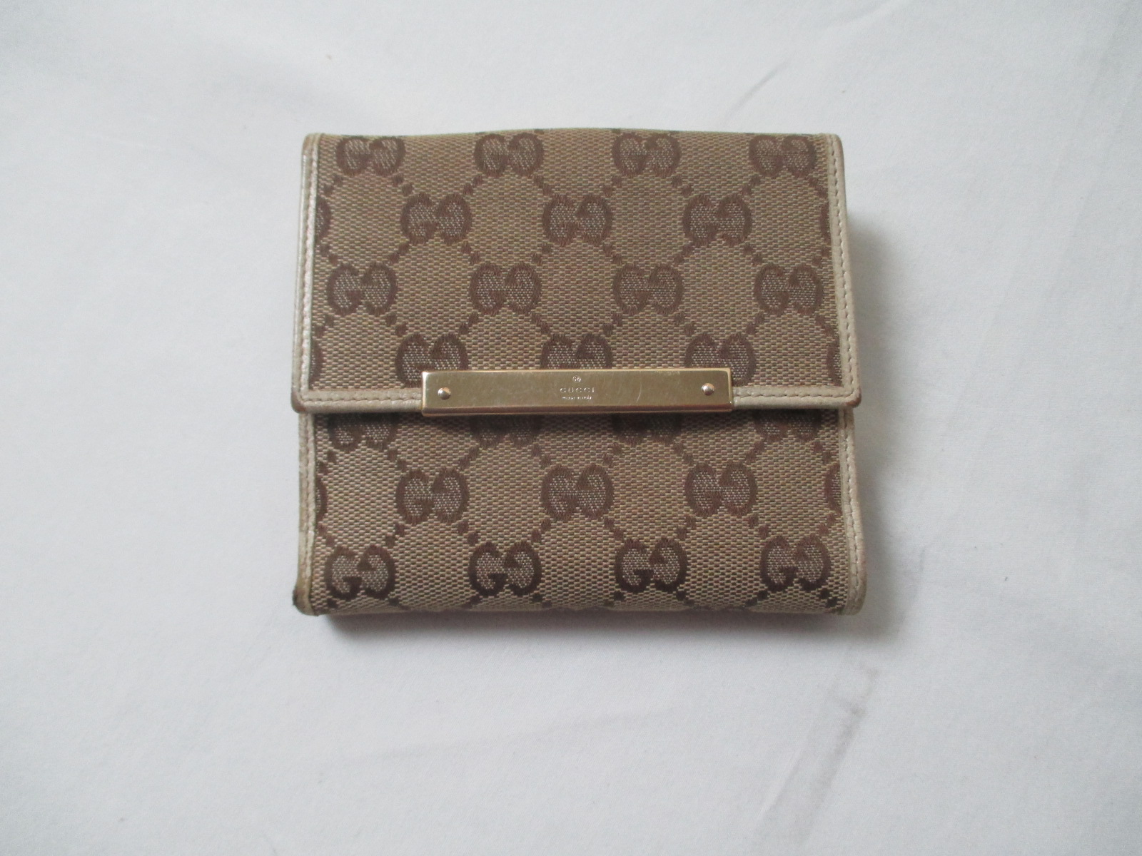 GGマークのキャンバス生地に周りが革巻きされた財布になります。