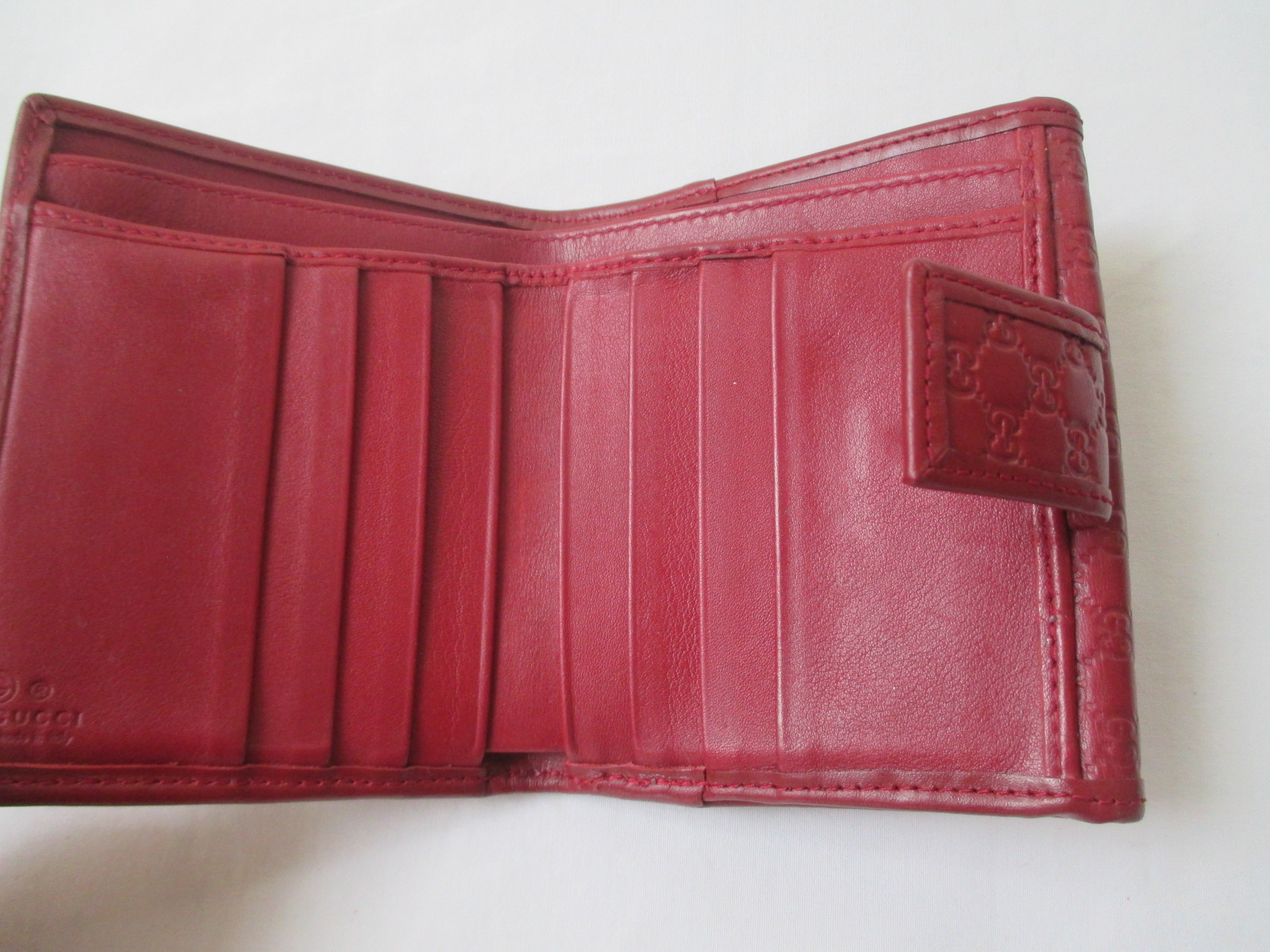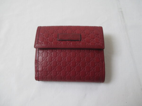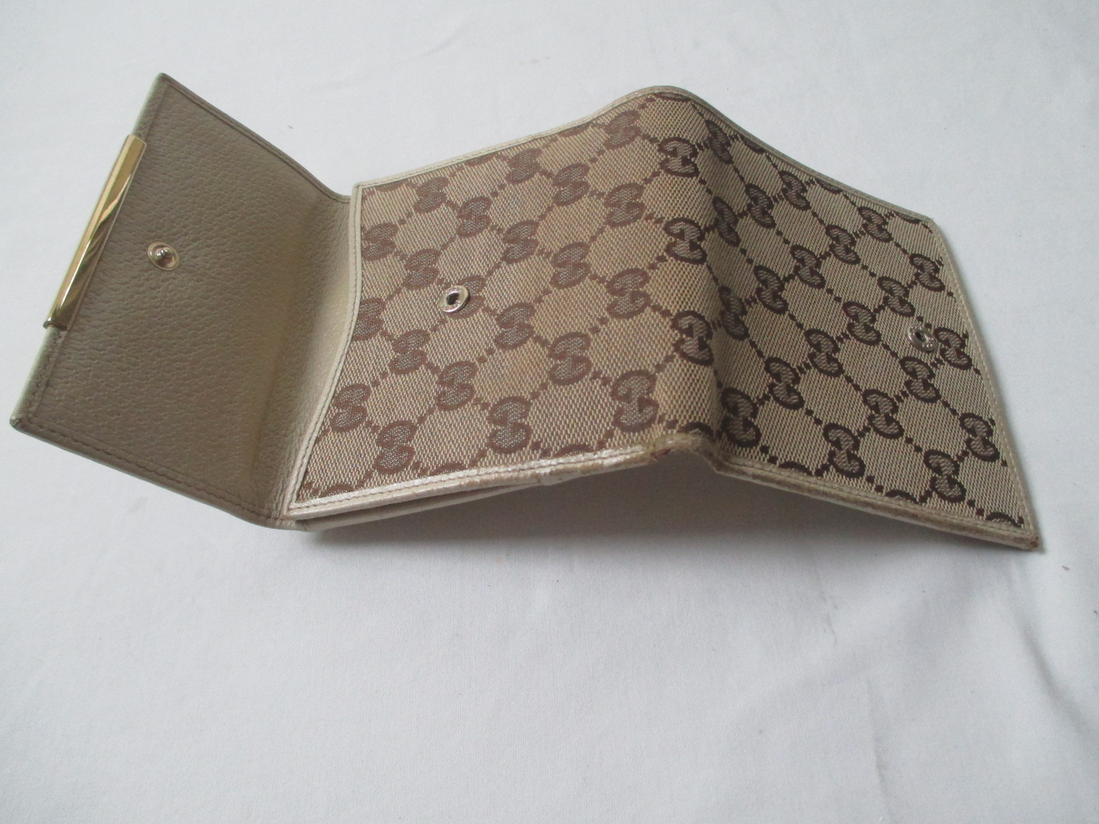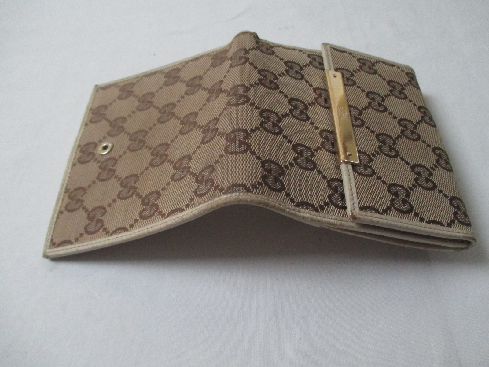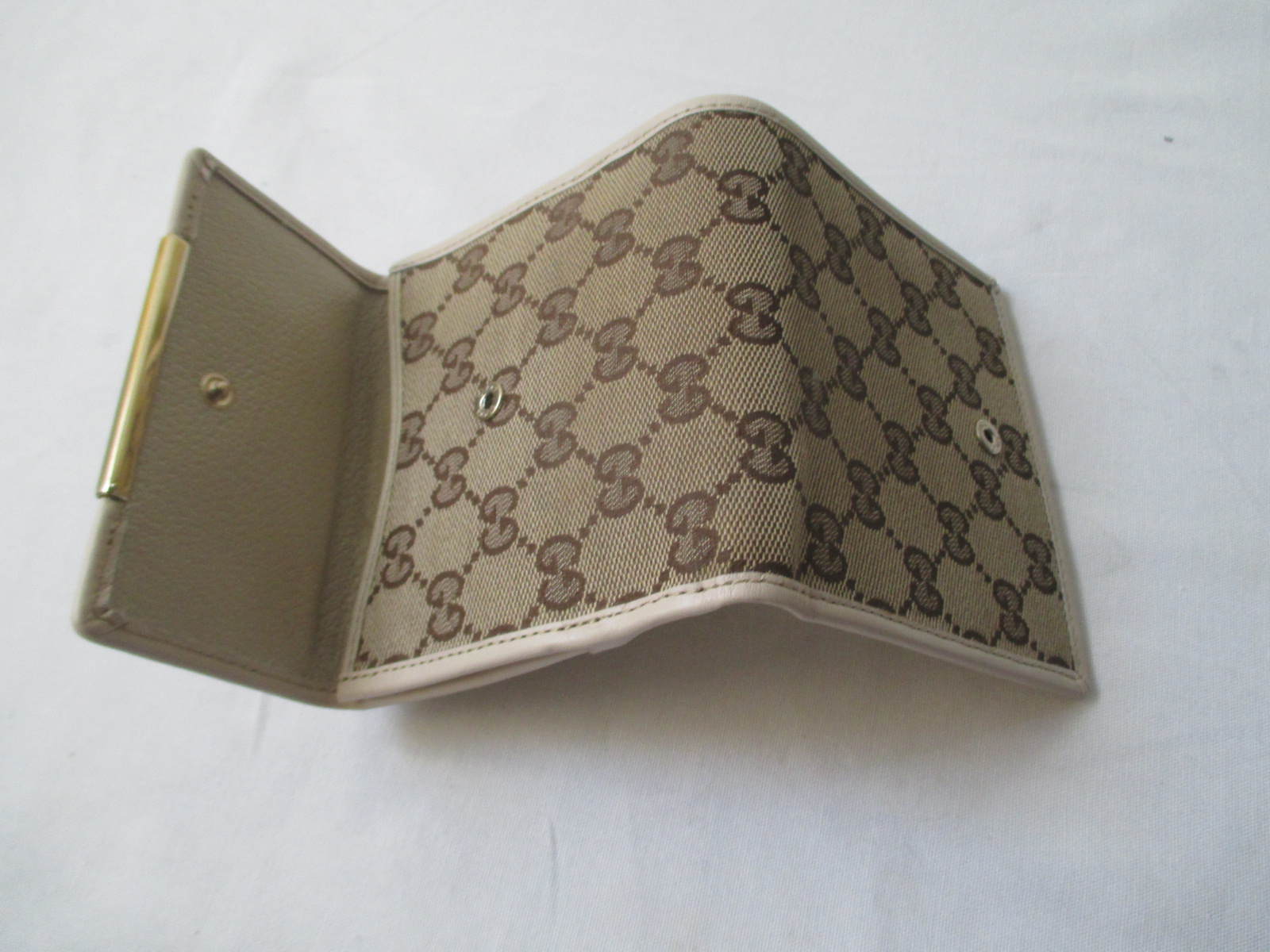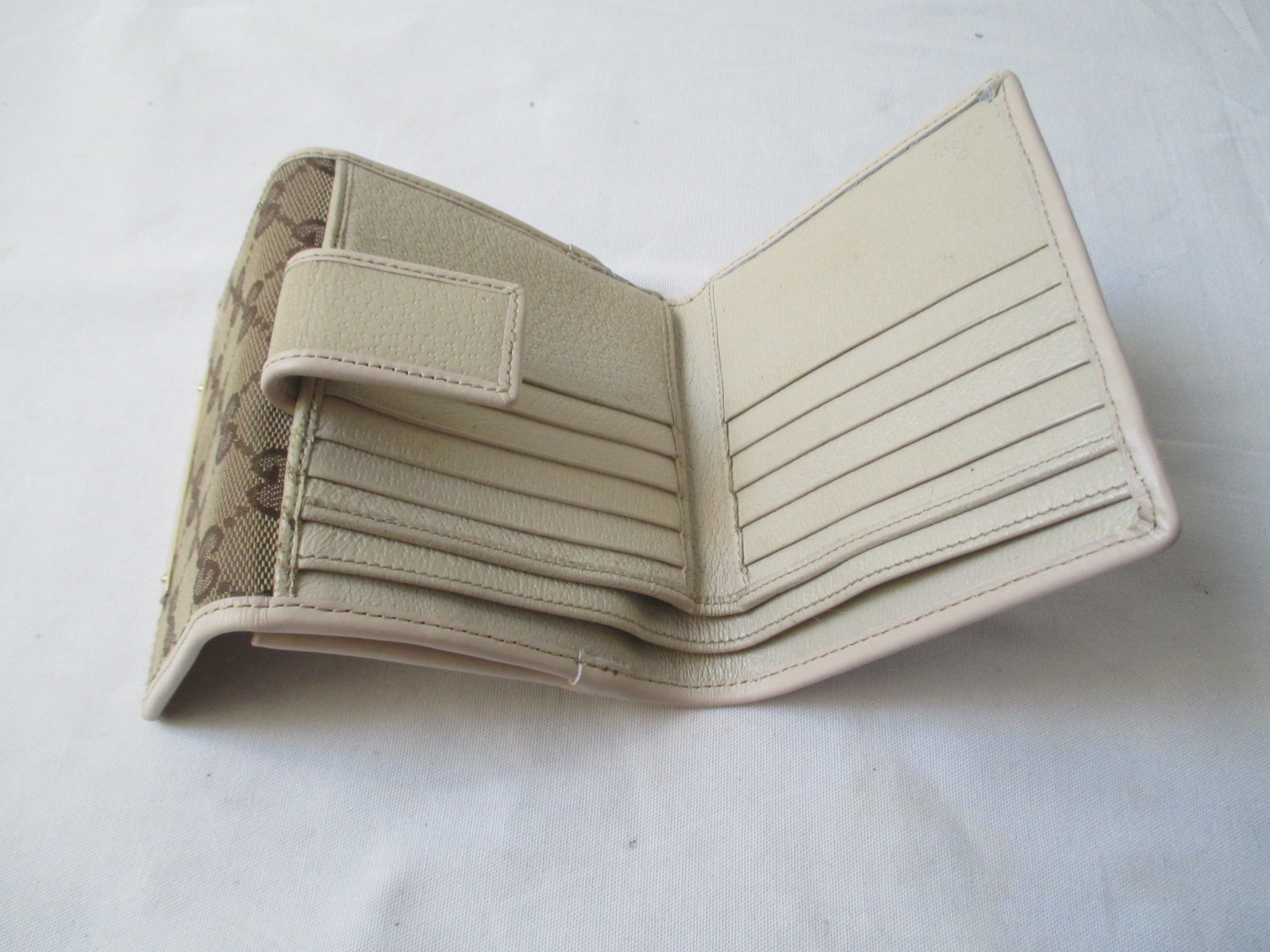 GGマークのキャンバス生地に周りが革巻きされた財布になります。